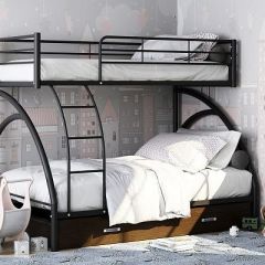 Конструкция кровати предусматривает спальные места разных размеров: верхнее 90*190 см и нижнее 120*190 см. Верхний ярус защищен прочными бортиками. Лестницу можно установить с любой стороны. Кровать оборудована большим выкатным ящиком для белья или дргих вещей.