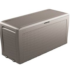 Самоа - превосходный сундук для подушек и садовых аксессуаров. Крепкий и прочный ящик. Полностью устойчив к погодным условиям и ультрафиолетовому излучению. Ящик изготовлен из пластика, поэтому он не нуждается в уходе. Встроенные ручки и ролики упрощают перемещение. Легкий и быстрый монтаж – без помощи инструментов. Закрывается на замок (замок не прилагается). Красивое ротанговое плетение. Эстетичный вид – хорошая цена.