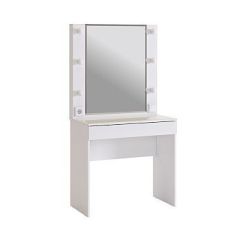 Состоит из: зеркала с подсветкой, встроенного выключателя, розетки для фена, стеклянной столешницы и выдвижного ящика.